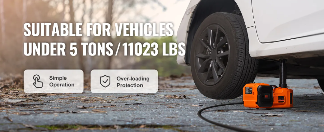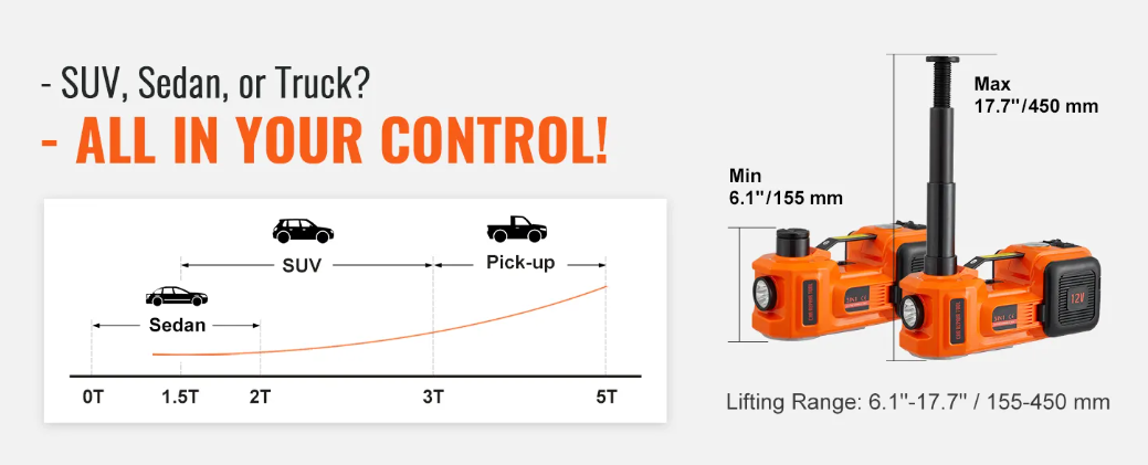- Powerful Electric Car Jack: Lifting capacity: 11023 lbs. Lifting Range: 6.1''-17.7". This electric car jack kit is a lifesaver during roadside emergencies and can be used for at-home garage repairs. It matches all autos, sedans, SUVs, trucks, or vehicles that suit its capacity.