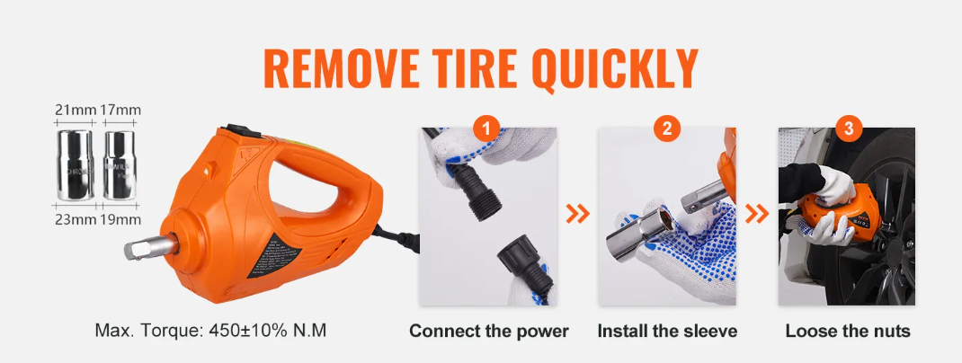 The wrench is easy and safe to use. Choose the correct sleeve, attach it to your lug nuts, and press the power button until the nut loosens or tightens. The powerful motor ensures reliable performance even in harsh conditions. Using this tool, you can change tires in minutes without hiring skilled workers, saving you time and money.