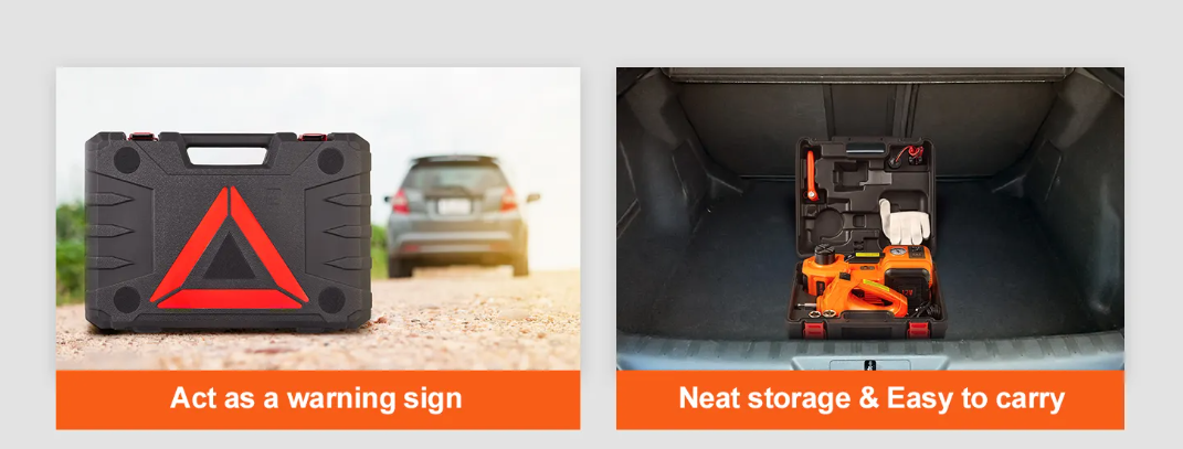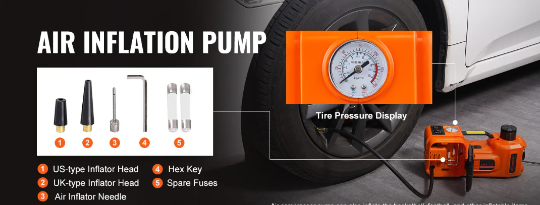 Quick Tire Inflation: With a tire inflator pump installed in the electric hydraulic car jack, there is no need to worry about a tire-broken emergency in the middle of nowhere. Hidden toolboxes on both sides keep the inflatable tube and inflatable needles for quick tire inflation well organized. Equipped with a tire pressure display, you can monitor the tire pressure while pumping.