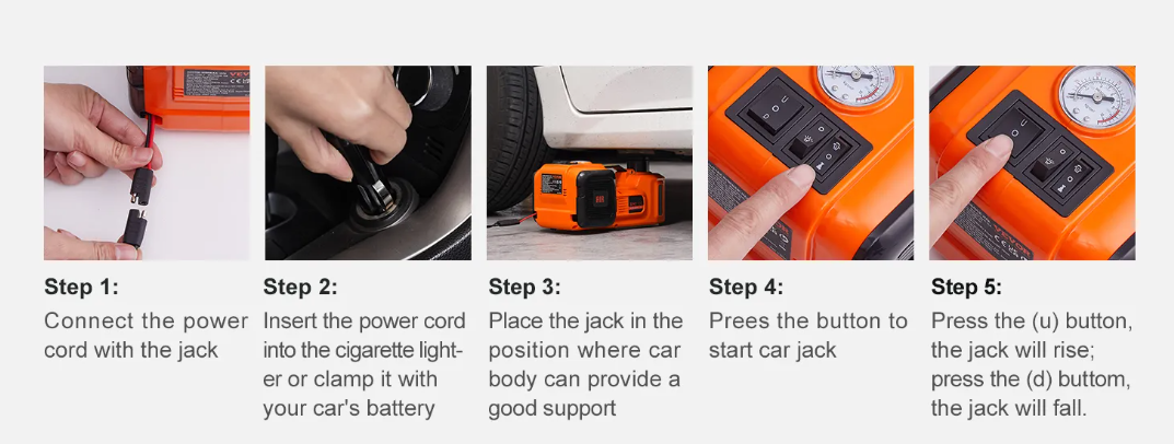 - More Than 1 Way to Charge: The electric hydraulic jack for your vehicle can be powered by a 12V cigarette lighter or car battery and equipped with a long 13 ft power cord so you can place it by the front or rear tire without having to think twice. We also provide you with three spare fuses, and our fuses are TUV, and, so you can use them confidently!