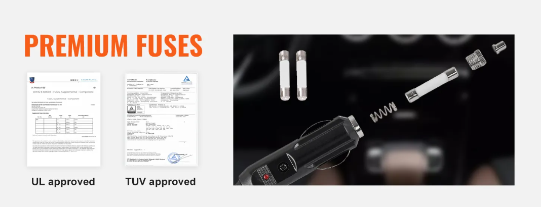 The two-power arrangement is convenient in the garage, car park, or on the roadside. Three T-UV-certified spare fuses are also provided in the kit and are safe and reliable. The additional fuses and the long cable allow you to install the jack wherever you want without worrying about power or distance.