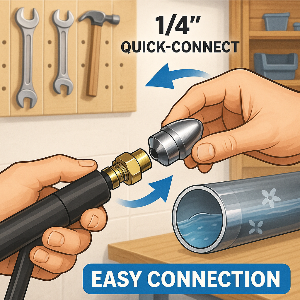 No complicated tools, no special skills required. The nozzle comes with a standard 1/4″ quick connector, compatible with most pressure washers on the market. In just seconds, you can snap it on and start cleaning. Simple to install, simple to use—anyone can operate it with ease.